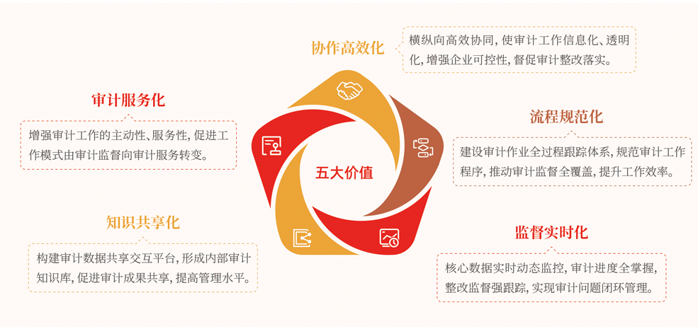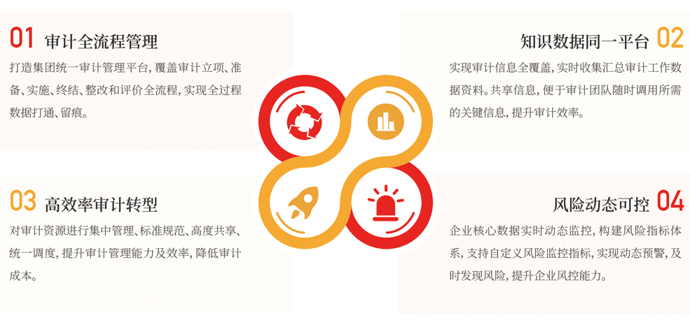 審計(jì)管理(lǐ)系統,協助企業完善審計(jì)工作(zuò)管理(lǐ)體(tǐ)系,實現審計(jì)立項、審計(jì)準備、審計(jì)實施、審計(jì)終結、審計(jì)整改、審計(jì)評價的全過程動态跟蹤與管控。結合企業審計(jì)工作(zuò)實際運轉方式,滿足審計(jì)業務開(kāi)展過程中各環節的管理(lǐ)與應用,推進審計(jì)管理(lǐ)與審計(jì)行(xíng)為(wèi)的透明(míng)化、規範化和(hé)高(gāo)效化,降低(dī)企業風險,提升審計(jì)工作(zuò)效率,加強企業內(nèi)部合規性。滿足國有(yǒu)企業內(nèi)部風險管控需求,廣泛适用于具有(yǒu)審計(jì)職能的國有(yǒu)企業,覆蓋投資平台、工程建設、市政建設、房(fáng)地産建設、環保水(shuǐ)務、交通(tōng)能源、資産運營管理(lǐ)、醫(yī)療健康、休閑旅遊等行(xíng)業。